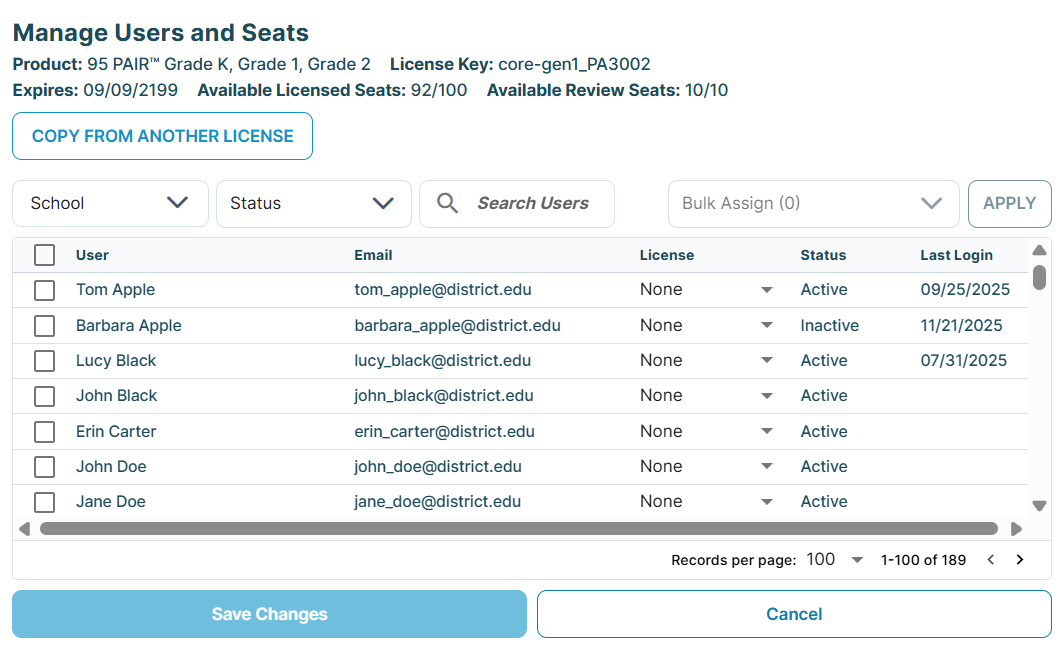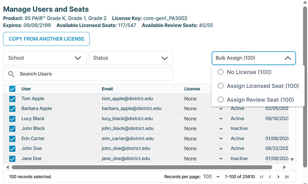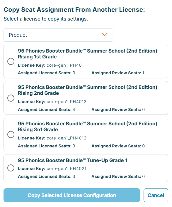 Note: The total number of licensed seats available for each product is based on your district’s order. Contact support@one95.app if your district’s purchased licensed seats are not reflected in One95.
