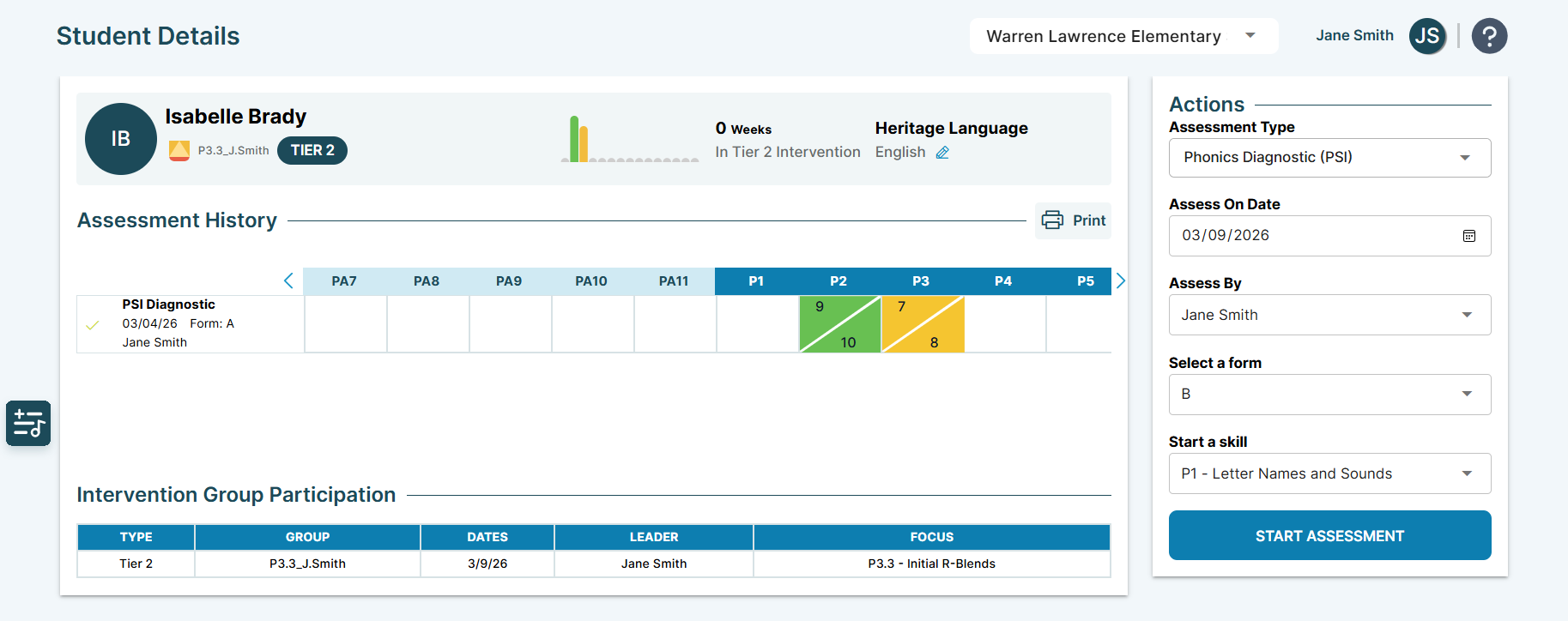 - If the group’s starting skill is a Phonics Screener for Intervention™ (PSI) skill, the associated skill will be displayed. Note that Skill P1 will reflect Skill 2.
