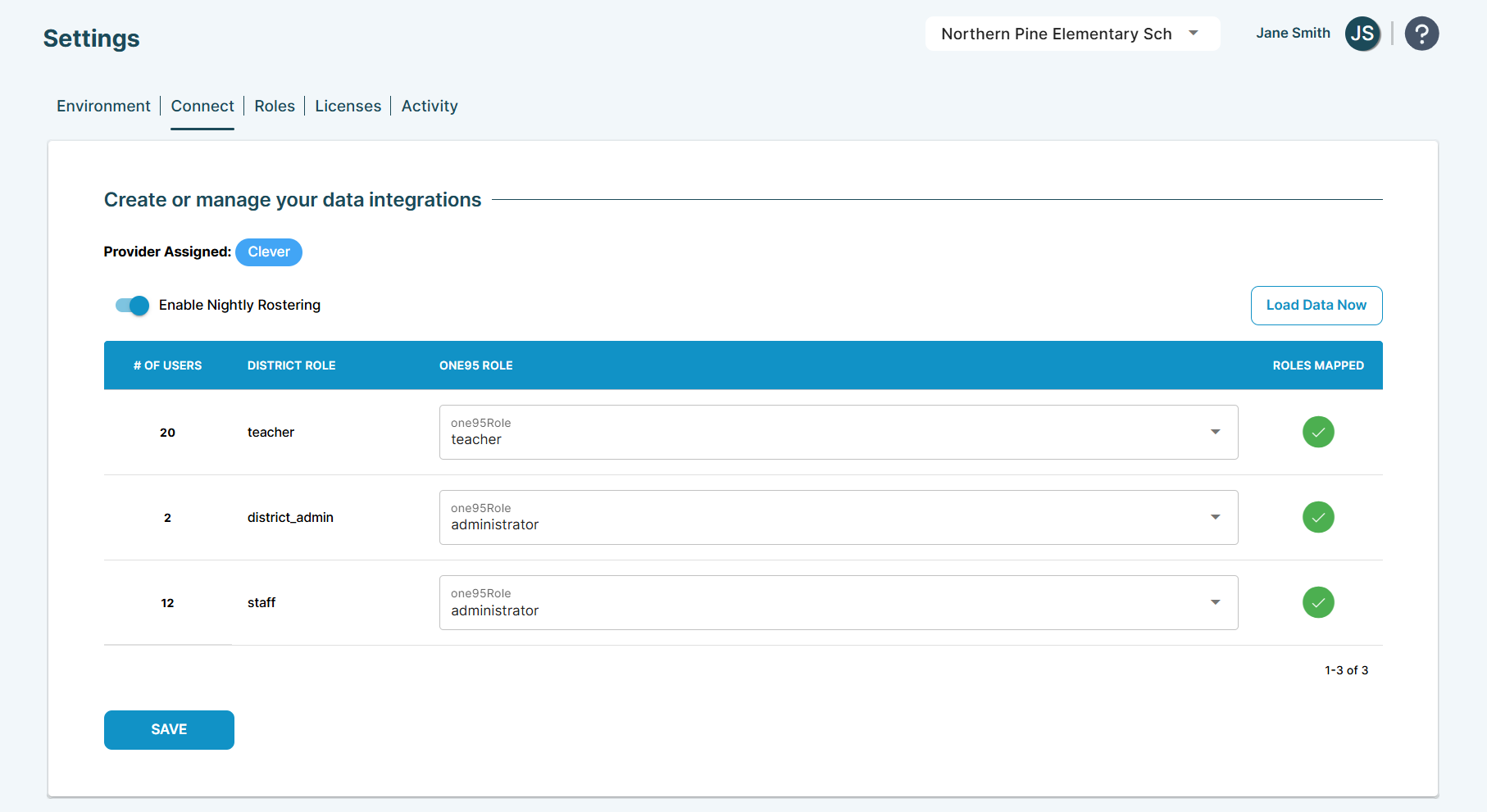 One95 Administrators can manually synchronize data by clicking Load Now at any time, even with the nightly updates enabled. For example, if there is a user added to Clever who needs immediate access, you do not have to wait for the nightly re-rostering to get them up and running.