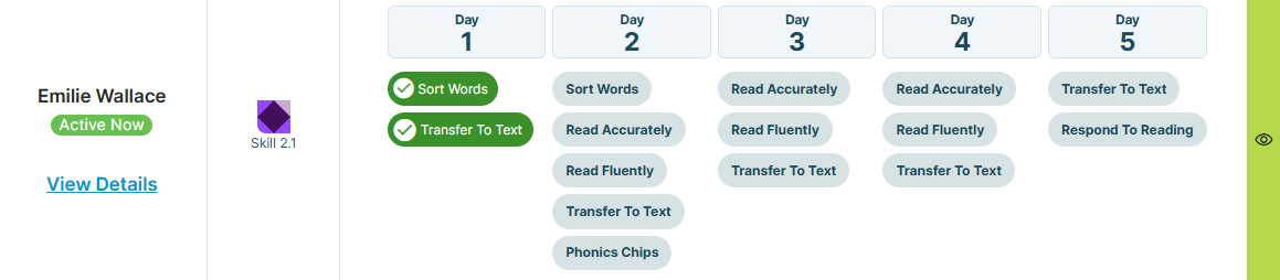 After selecting a subskill tile from the flipbook homepage, the day-by-day breakdown will be displayed.