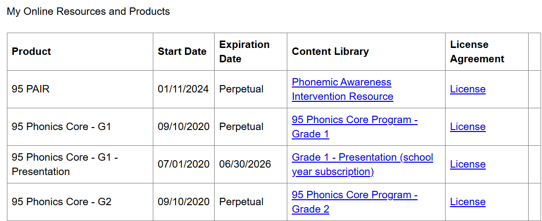 Once the grace period has passed, 95 Phonics Core Program™ (PCP) resource tiles will only contain ancillary materials. Non-PCP resource tiles will be inaccessible.