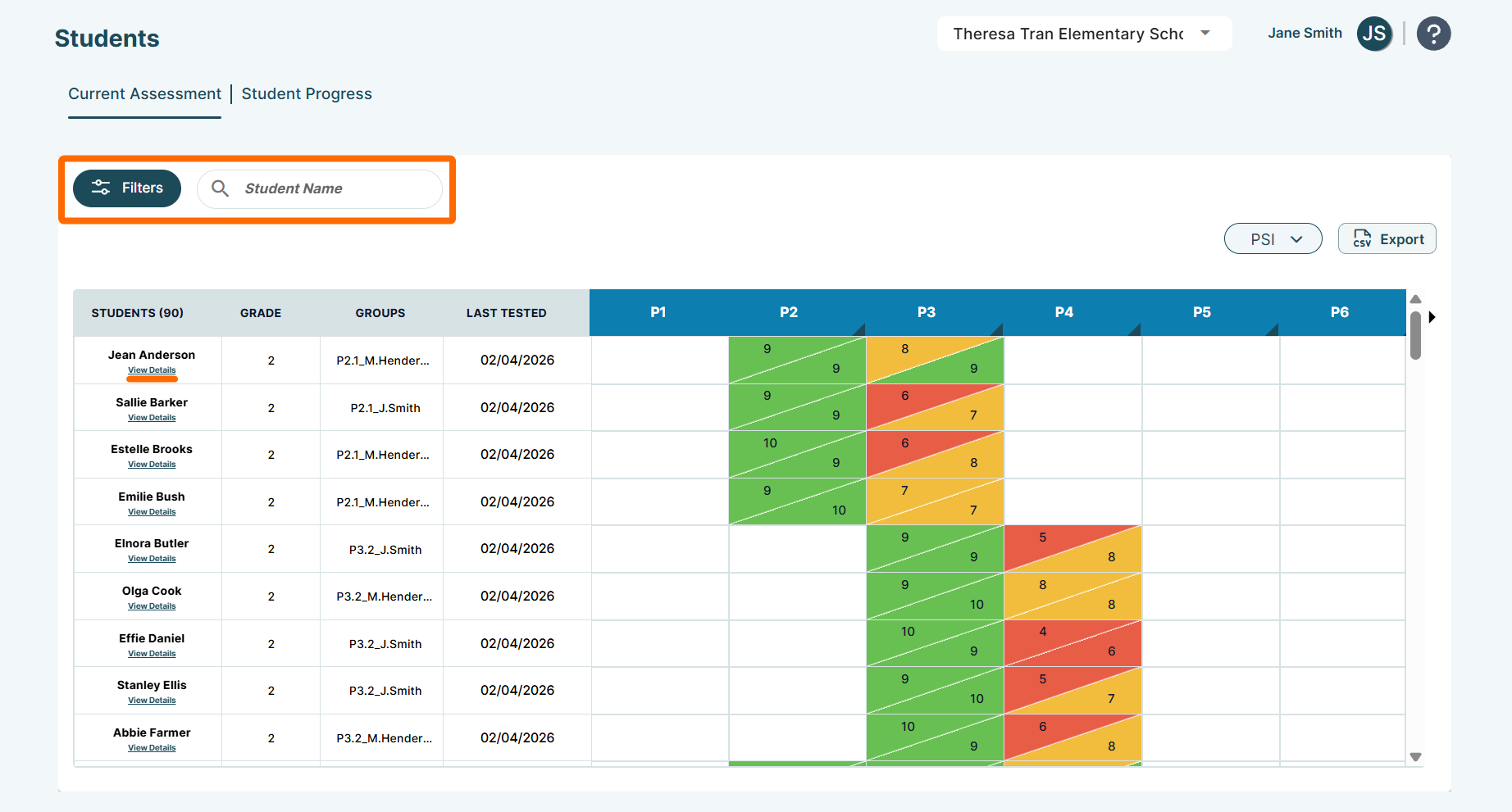 • On the Students page, use the filter options to find the students you’re associated with, or simply search for the student you're assessing by typing their name in the search bar. Once you find your student, click View Details under their name to access the digital assessments.
