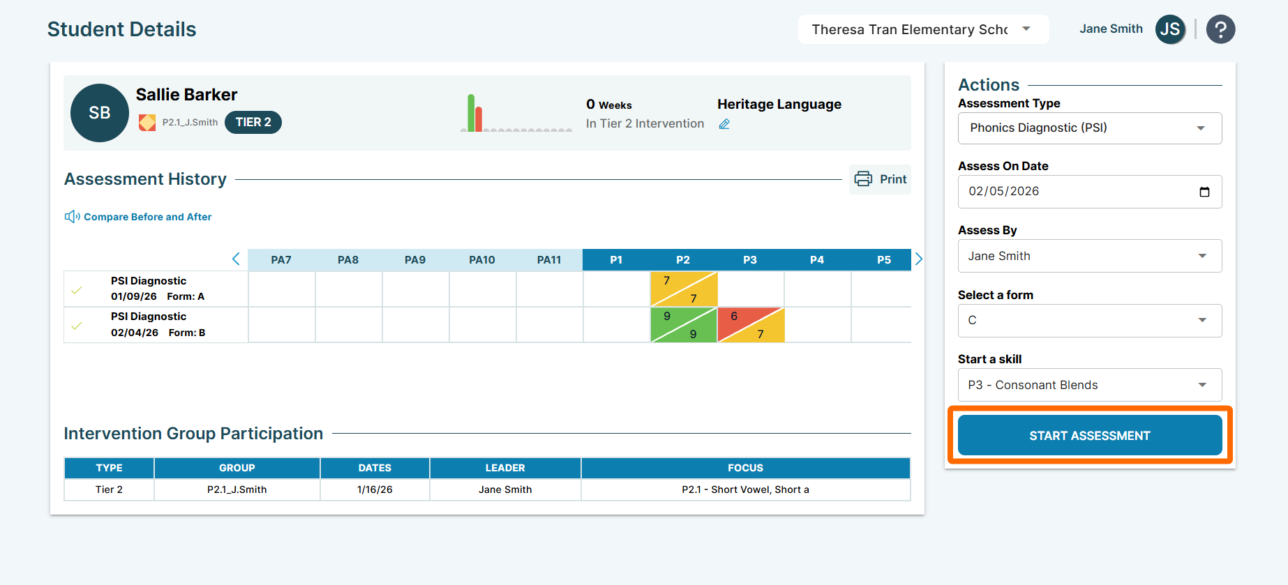 • Select assessment and starting skill - Choose the appropriate assessment and skill level based on the student's grade and time of year recommendations chart.