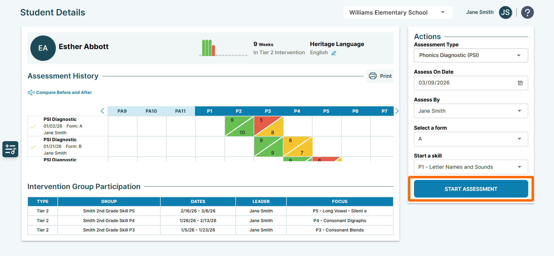 - Select assessment and starting skill - Choose the appropriate assessment and skill level based on the student's grade and time of year recommendations chart.